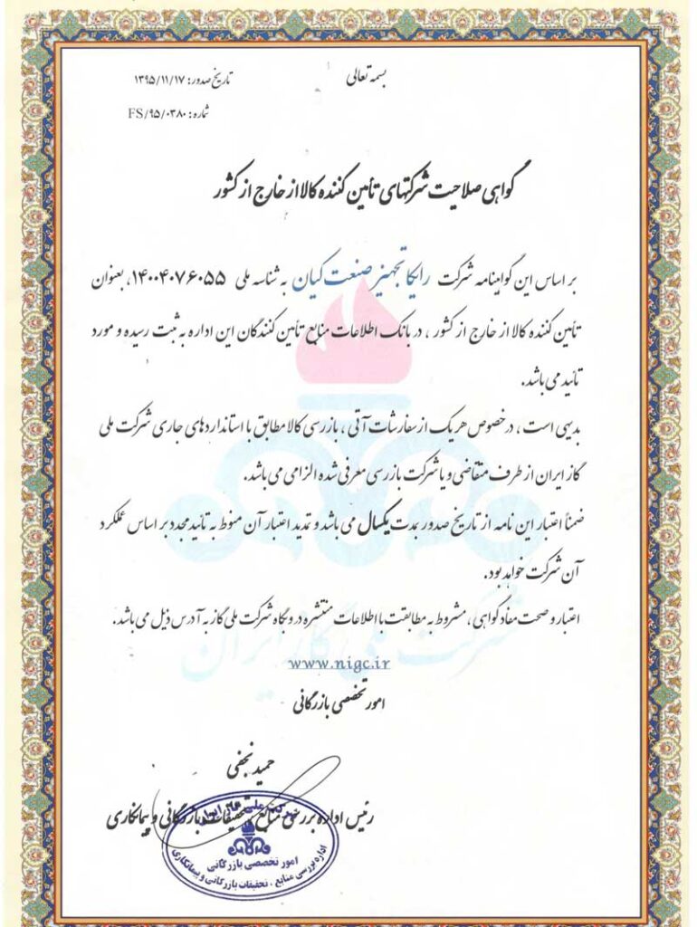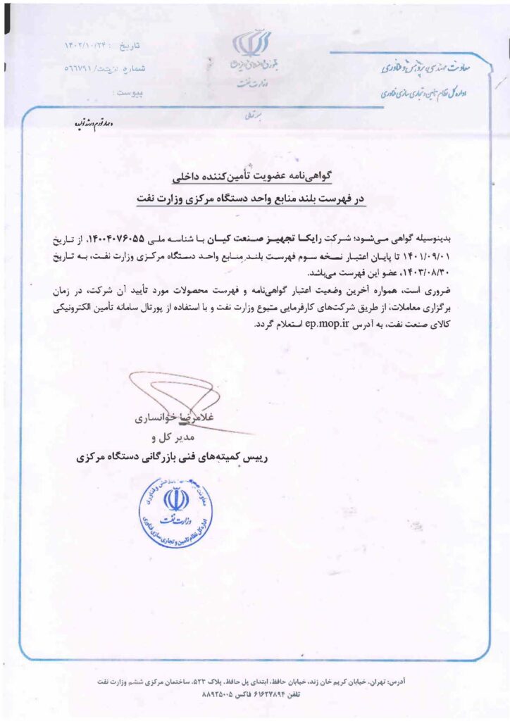 شرکت مهندسی بازرگانی رایکا تجهیز صنعت کیان با بیش از یک دهه تجربه پیوسته توانسته، با تکیه بر شعار همیشگی خود "همواره به تعهداتمان پایبندیم" و با به کارگیری پتانسیل های علمی و تجربی خود و در اختیار داشتن کادری مجرب، متشکل از متخصصان فنی و بازرگانی توانمند و با بهره گیری از توانمندی های شرکت های معتبر خارجی و داخلی در زمینه های تامین وساخت تجهیزات پایپینگ (پایپ-ولو-فیتینگ) و ابزار دقیق در پروژه های نفت گاز و پتروشیمی,فولاد, مس و معدن پاسخگو نیاز مشتریان خود باشد.